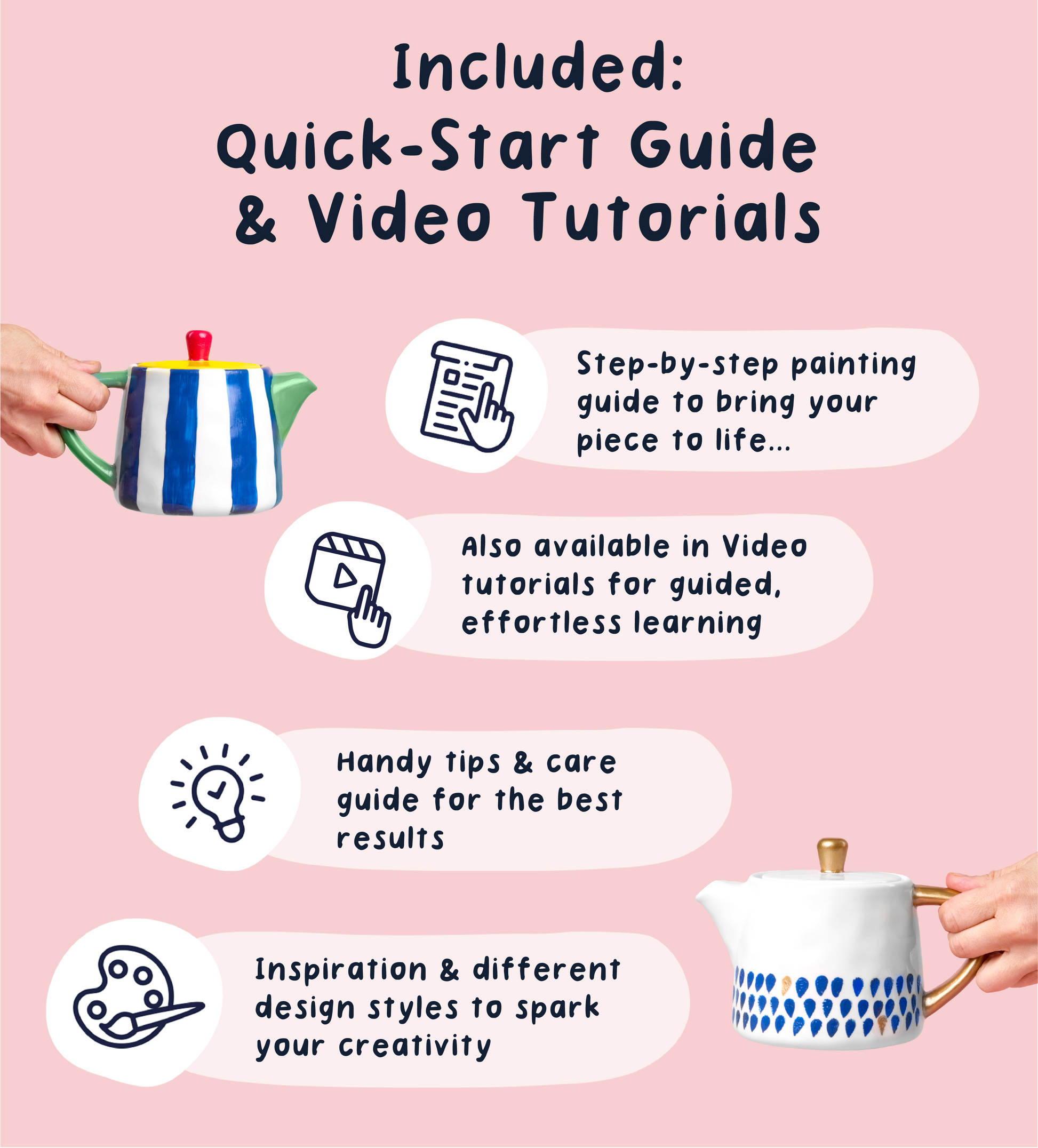 Received teapot in excellent condition and was very happy with the multiple tutorials and brushes provided. I am not overly creative so I used one of the designs provided but changed the colors. After painting, let it air dry and baked as instructed, boom, done!