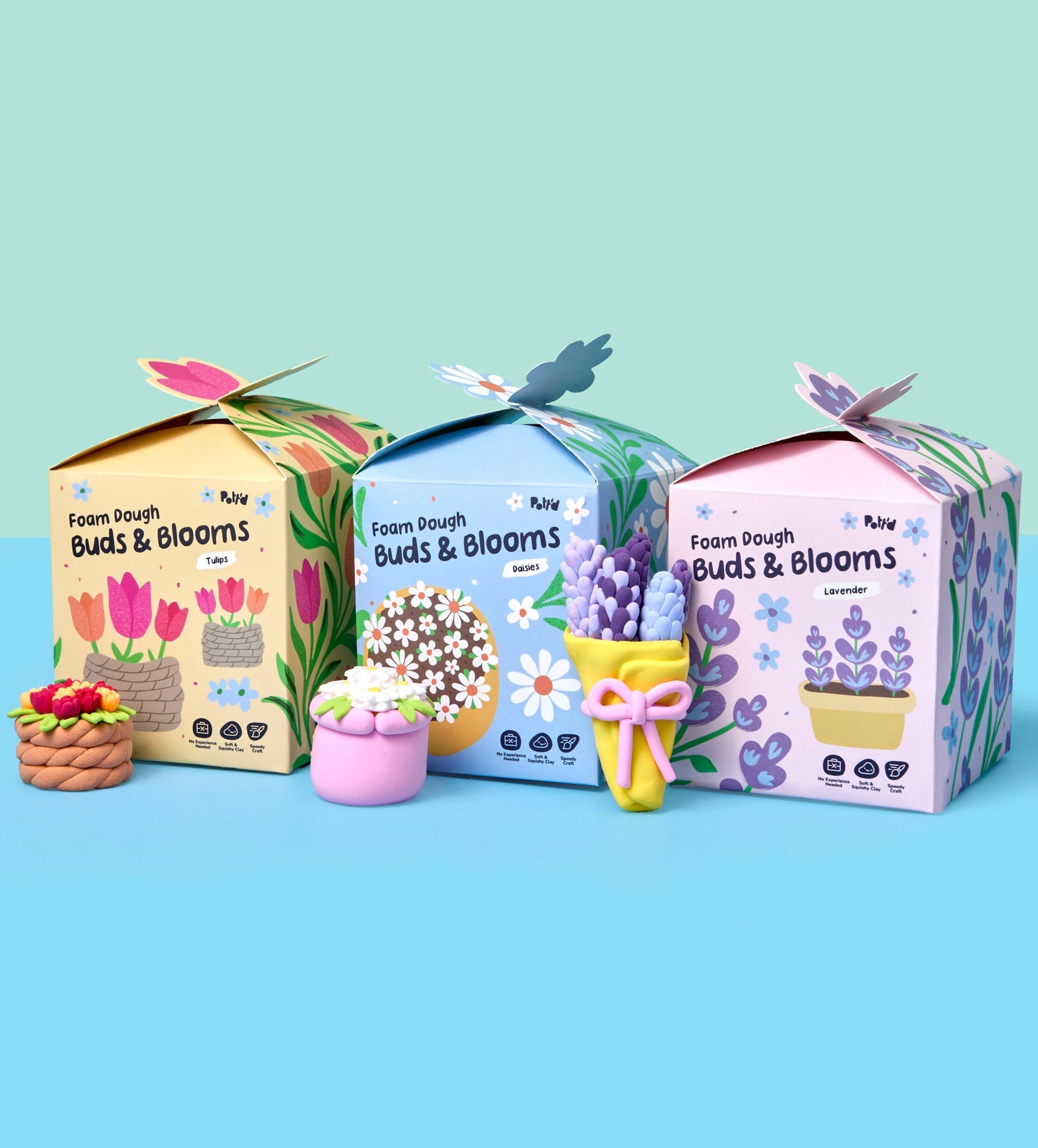 Say it with flowers – and keep them blooming forever. The Flower Series brings together three classics: elegant lavender, playful daisies and bold tulips. Crafted with Foam Dough, these blossoms are as fun to squish and sculpt as they are to display once they’re dry.